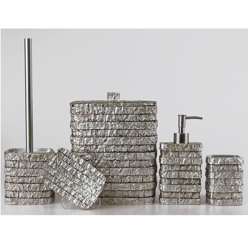 Modern tarzda taş duvar görünümlü bu banyo setine, gümüş rengi canlı ve dikkat çekici bir görünüm verir. Banyo dekorasyonu için 1.sınıf reçineden tasarlanmış çöp kovası, tuvalet fırçası, sıvı sabunluk, katı sabunluk ve diş fırçalıktan oluşan şık ve modern banyo setidir. Ev ve ofis kullanımına uygun banyo takımlarından olan Stone banyo seti, banyonuza mükemmel ve modern bir stil kazandırmak için tasarlanmış banyo seti modellerindendir.